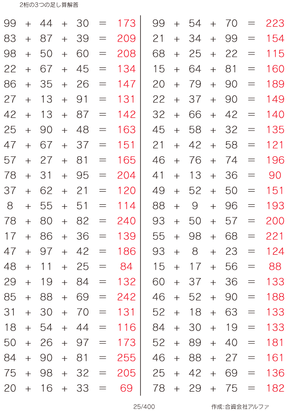 上記のボタンから「2桁の3つの足し算」の算数数学ドリル・計算ドリル(PDFプリント)がダウンロードできます。個人利用は無料です(家庭以外での配布は有料です)。