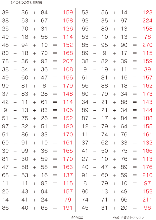 上記のボタンから「2桁の3つの足し算」の算数数学ドリル・計算ドリル(PDFプリント)がダウンロードできます。個人利用は無料です(家庭以外での配布は有料です)。