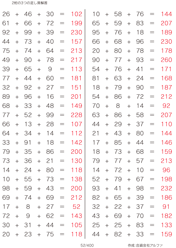 上記のボタンから「2桁の3つの足し算」の算数数学ドリル・計算ドリル(PDFプリント)がダウンロードできます。個人利用は無料です(家庭以外での配布は有料です)。