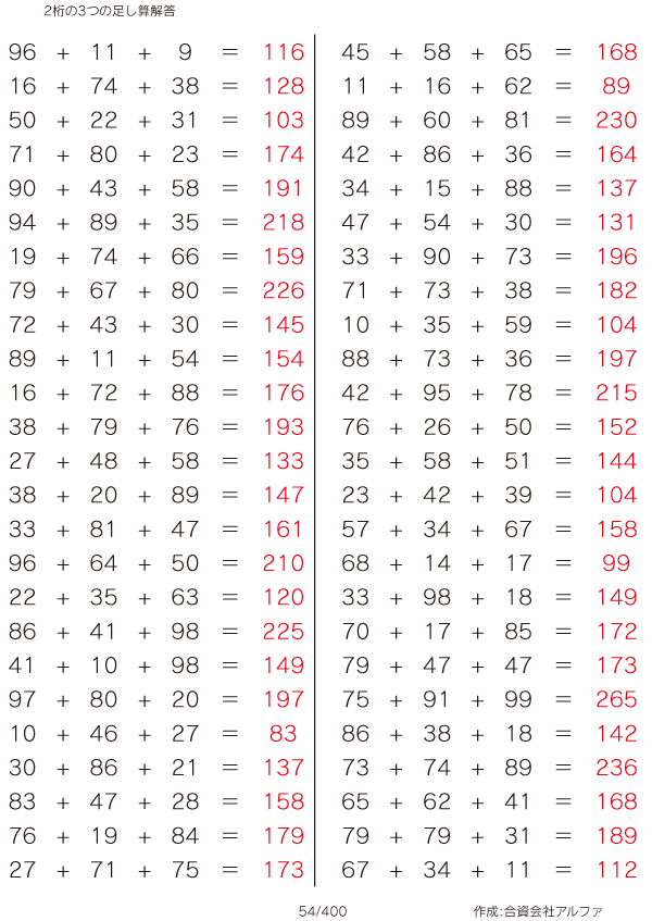 上記のボタンから「2桁の3つの足し算」の算数数学ドリル・計算ドリル(PDFプリント)がダウンロードできます。個人利用は無料です(家庭以外での配布は有料です)。
