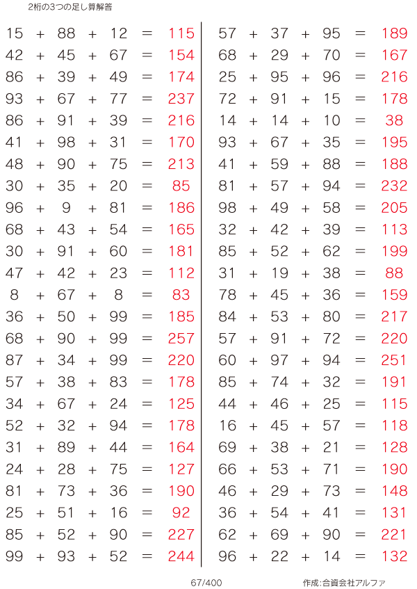 上記のボタンから「2桁の3つの足し算」の算数数学ドリル・計算ドリル(PDFプリント)がダウンロードできます。個人利用は無料です(家庭以外での配布は有料です)。