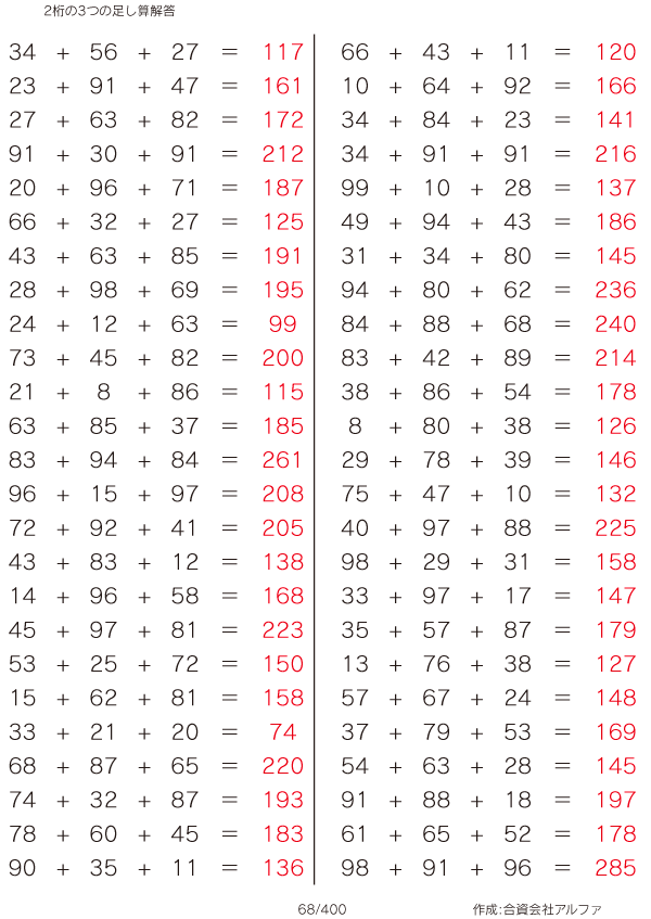 上記のボタンから「2桁の3つの足し算」の算数数学ドリル・計算ドリル(PDFプリント)がダウンロードできます。個人利用は無料です(家庭以外での配布は有料です)。