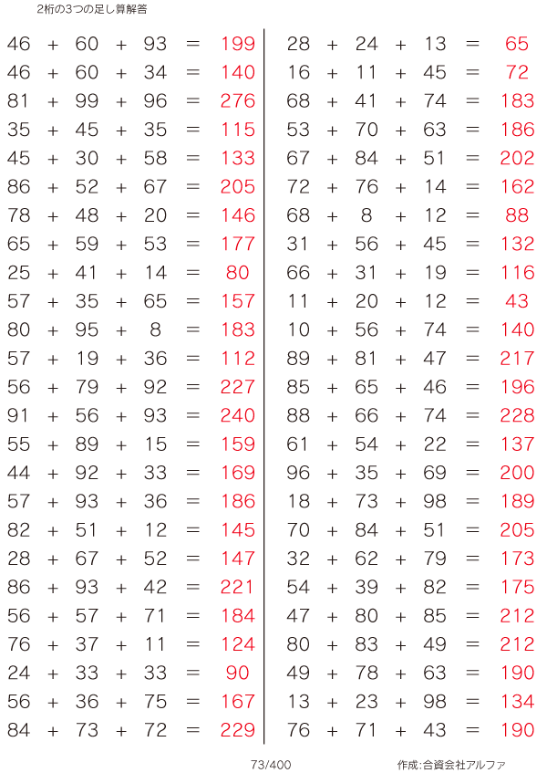上記のボタンから「2桁の3つの足し算」の算数数学ドリル・計算ドリル(PDFプリント)がダウンロードできます。個人利用は無料です(家庭以外での配布は有料です)。