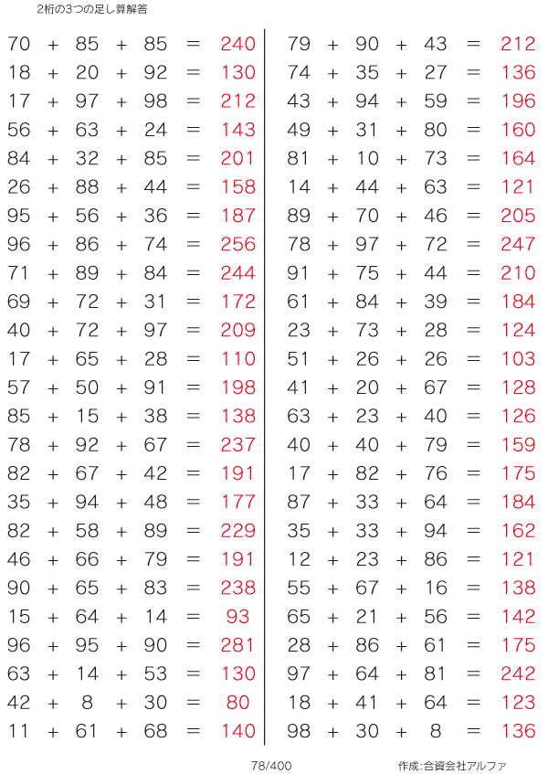 上記のボタンから「2桁の3つの足し算」の算数数学ドリル・計算ドリル(PDFプリント)がダウンロードできます。個人利用は無料です(家庭以外での配布は有料です)。
