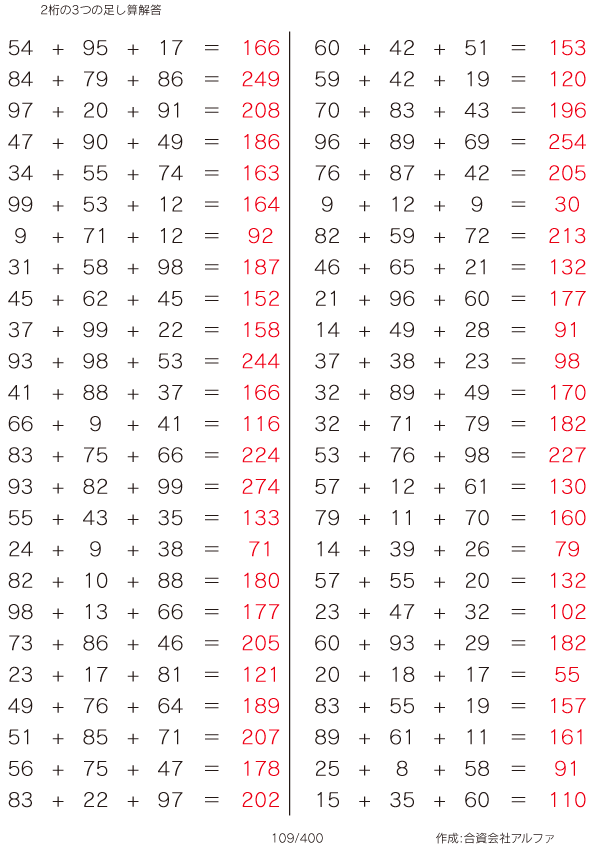 上記のボタンから「2桁の3つの足し算」の算数数学ドリル・計算ドリル(PDFプリント)がダウンロードできます。個人利用は無料です(家庭以外での配布は有料です)。