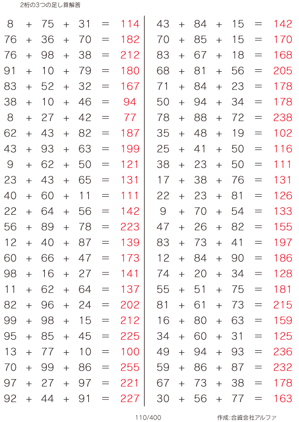 上記のボタンから「2桁の3つの足し算」の算数数学ドリル・計算ドリル(PDFプリント)がダウンロードできます。個人利用は無料です(家庭以外での配布は有料です)。