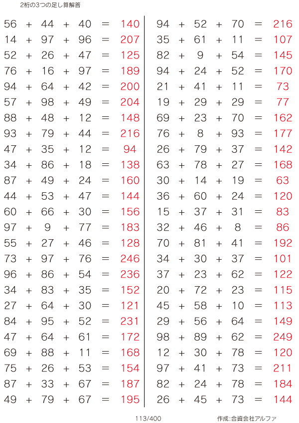 上記のボタンから「2桁の3つの足し算」の算数数学ドリル・計算ドリル(PDFプリント)がダウンロードできます。個人利用は無料です(家庭以外での配布は有料です)。