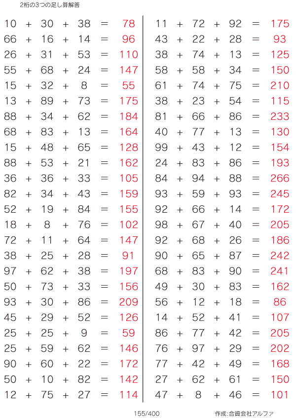 上記のボタンから「2桁の3つの足し算」の算数数学ドリル・計算ドリル(PDFプリント)がダウンロードできます。個人利用は無料です(家庭以外での配布は有料です)。