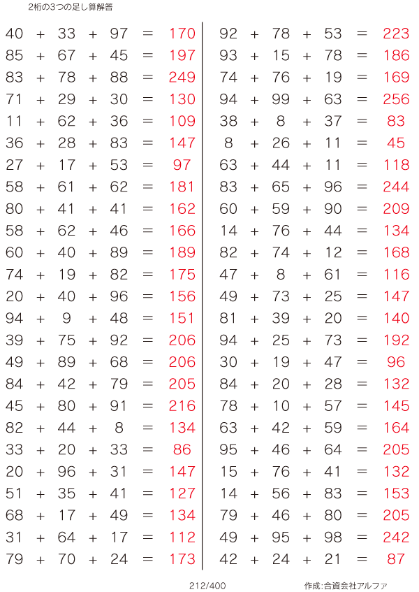 上記のボタンから「2桁の3つの足し算」の算数数学ドリル・計算ドリル(PDFプリント)がダウンロードできます。個人利用は無料です(家庭以外での配布は有料です)。