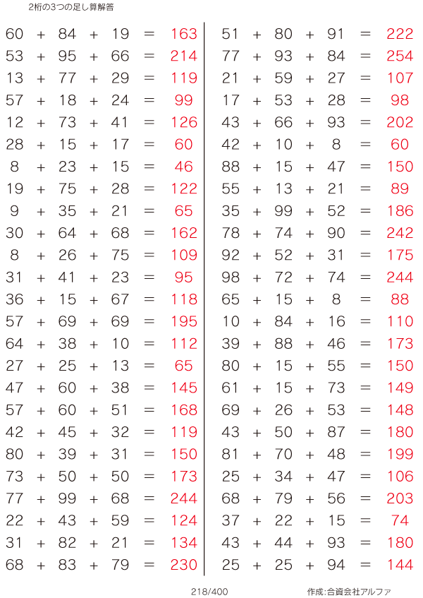 上記のボタンから「2桁の3つの足し算」の算数数学ドリル・計算ドリル(PDFプリント)がダウンロードできます。個人利用は無料です(家庭以外での配布は有料です)。