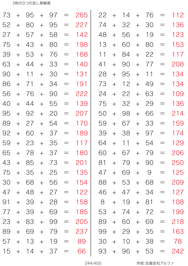 上記のボタンから「2桁の3つの足し算」の算数数学ドリル・計算ドリル(PDFプリント)がダウンロードできます。個人利用は無料です(家庭以外での配布は有料です)。