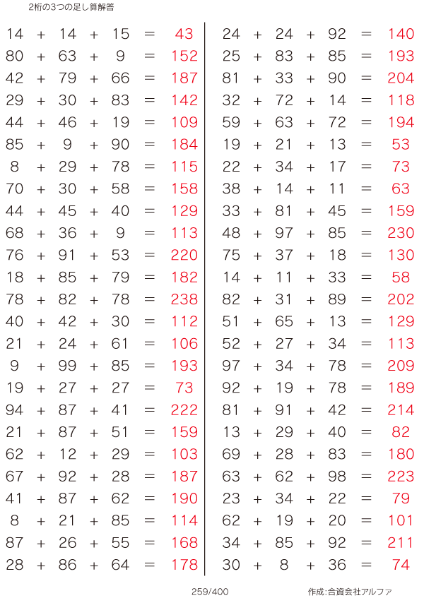上記のボタンから「2桁の3つの足し算」の算数数学ドリル・計算ドリル(PDFプリント)がダウンロードできます。個人利用は無料です(家庭以外での配布は有料です)。