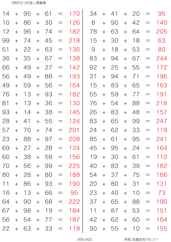 上記のボタンから「2桁の3つの足し算」の算数数学ドリル・計算ドリル(PDFプリント)がダウンロードできます。個人利用は無料です(家庭以外での配布は有料です)。