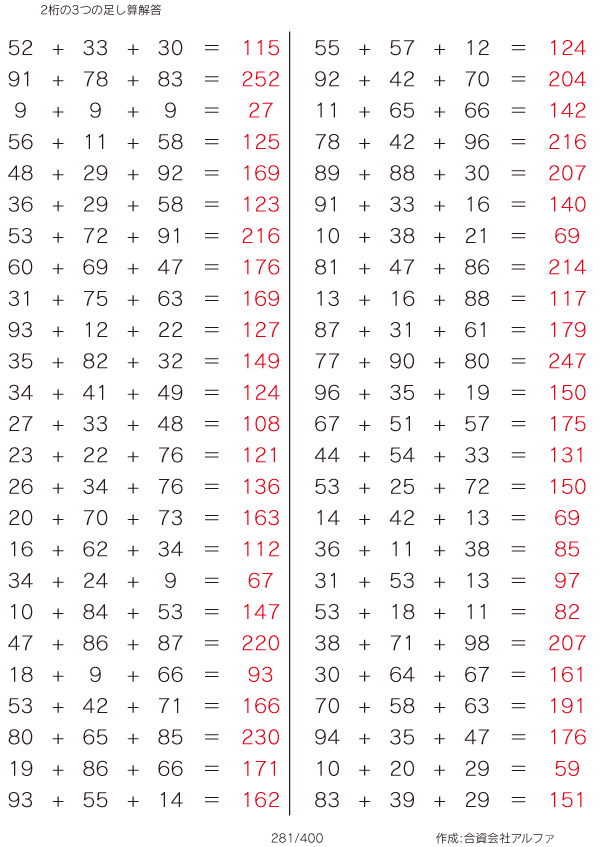 上記のボタンから「2桁の3つの足し算」の算数数学ドリル・計算ドリル(PDFプリント)がダウンロードできます。個人利用は無料です(家庭以外での配布は有料です)。