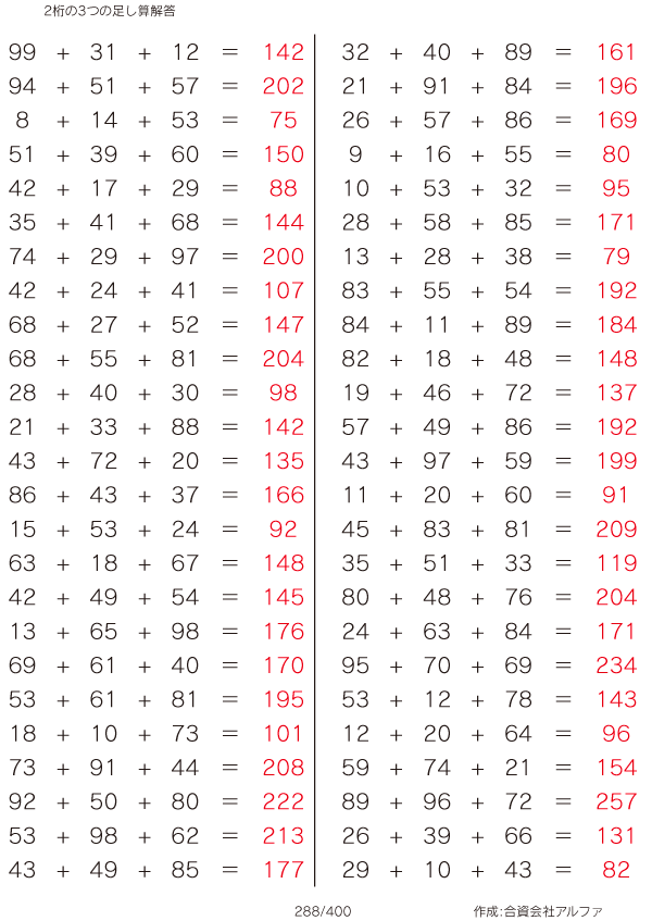 上記のボタンから「2桁の3つの足し算」の算数数学ドリル・計算ドリル(PDFプリント)がダウンロードできます。個人利用は無料です(家庭以外での配布は有料です)。