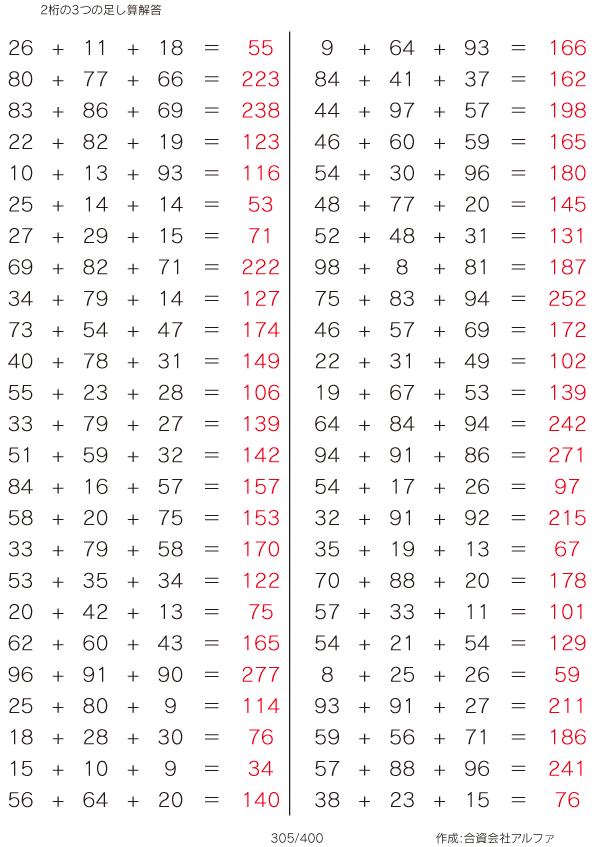 上記のボタンから「2桁の3つの足し算」の算数数学ドリル・計算ドリル(PDFプリント)がダウンロードできます。個人利用は無料です(家庭以外での配布は有料です)。