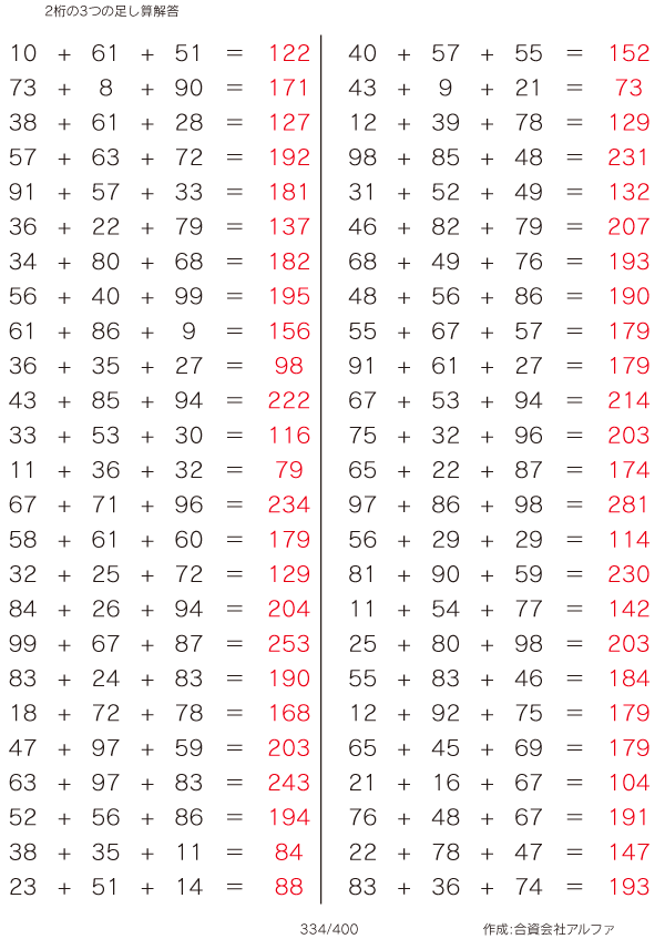 上記のボタンから「2桁の3つの足し算」の算数数学ドリル・計算ドリル(PDFプリント)がダウンロードできます。個人利用は無料です(家庭以外での配布は有料です)。