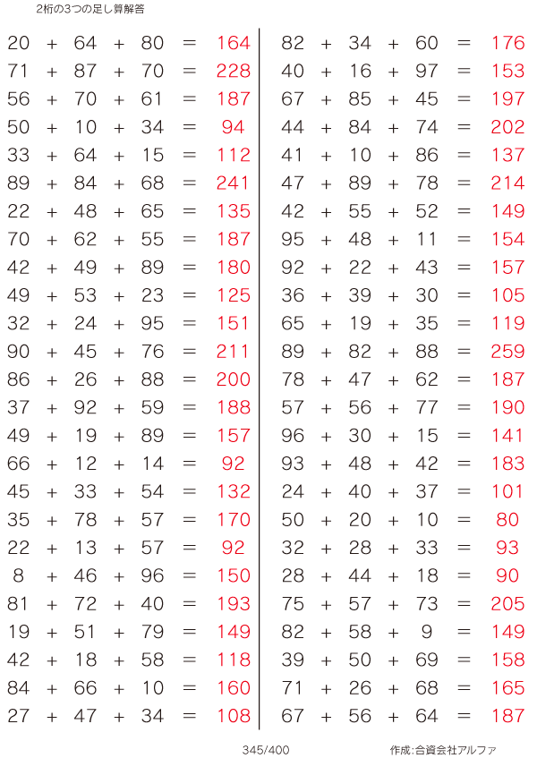 上記のボタンから「2桁の3つの足し算」の算数数学ドリル・計算ドリル(PDFプリント)がダウンロードできます。個人利用は無料です(家庭以外での配布は有料です)。
