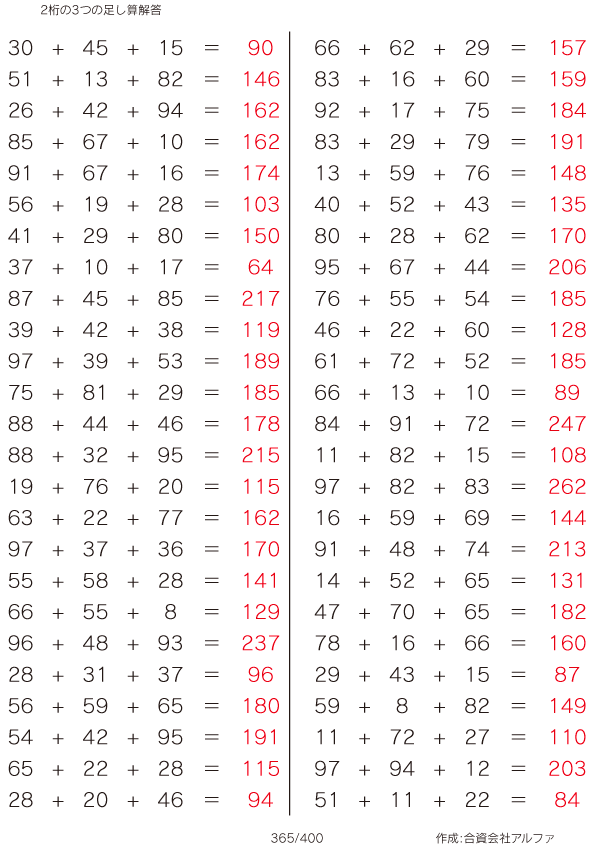 上記のボタンから「2桁の3つの足し算」の算数数学ドリル・計算ドリル(PDFプリント)がダウンロードできます。個人利用は無料です(家庭以外での配布は有料です)。