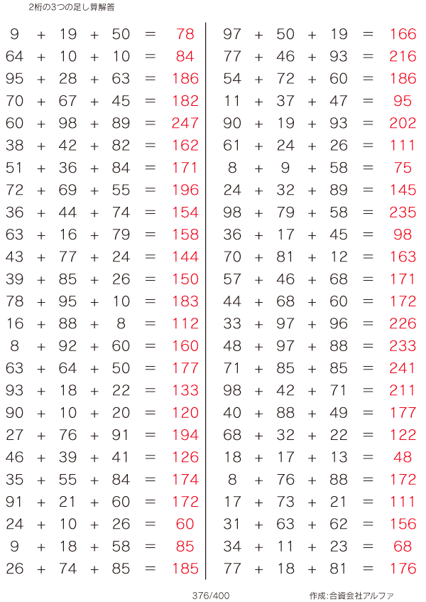 上記のボタンから「2桁の3つの足し算」の算数数学ドリル・計算ドリル(PDFプリント)がダウンロードできます。個人利用は無料です(家庭以外での配布は有料です)。
