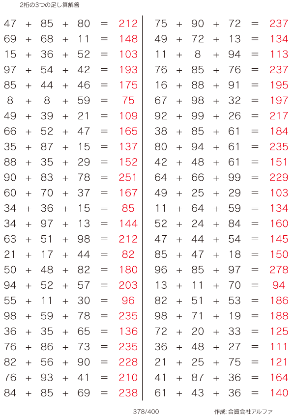 上記のボタンから「2桁の3つの足し算」の算数数学ドリル・計算ドリル(PDFプリント)がダウンロードできます。個人利用は無料です(家庭以外での配布は有料です)。