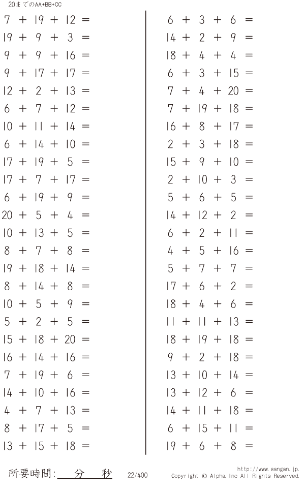 上記のボタンから「20までのAA+BB+CC」の算数数学ドリル・計算ドリル(PDFプリント)がダウンロードできます。個人利用は無料です(家庭以外での配布は有料です)。