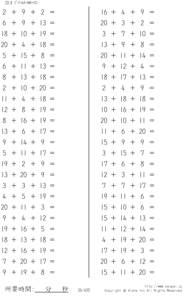 上記のボタンから「20までのAA+BB+CC」の算数数学ドリル・計算ドリル(PDFプリント)がダウンロードできます。個人利用は無料です(家庭以外での配布は有料です)。