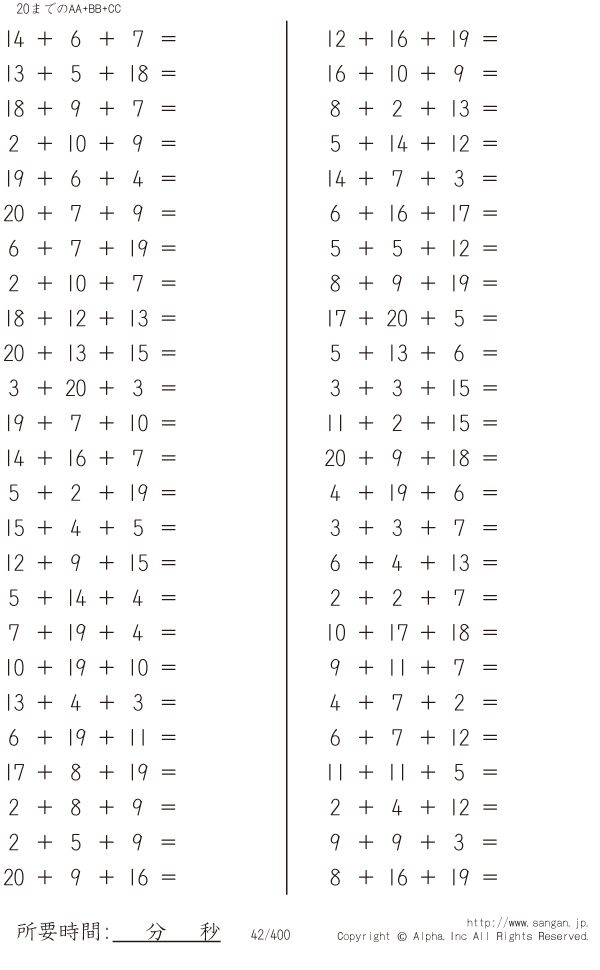 上記のボタンから「20までのAA+BB+CC」の算数数学ドリル・計算ドリル(PDFプリント)がダウンロードできます。個人利用は無料です(家庭以外での配布は有料です)。