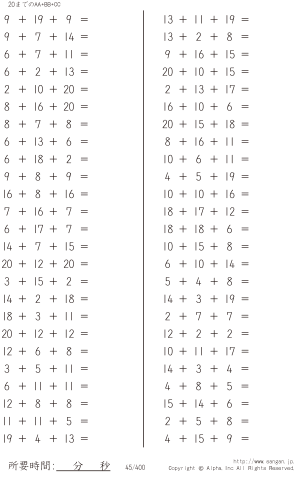 上記のボタンから「20までのAA+BB+CC」の算数数学ドリル・計算ドリル(PDFプリント)がダウンロードできます。個人利用は無料です(家庭以外での配布は有料です)。