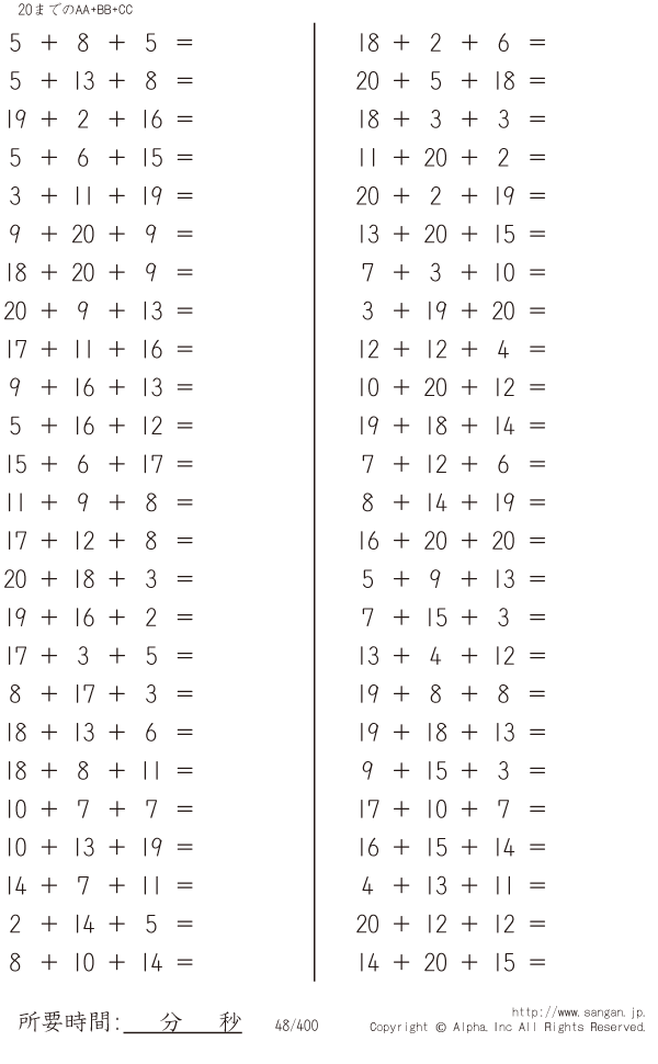 上記のボタンから「20までのAA+BB+CC」の算数数学ドリル・計算ドリル(PDFプリント)がダウンロードできます。個人利用は無料です(家庭以外での配布は有料です)。