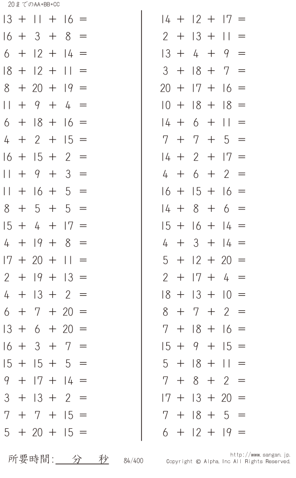 上記のボタンから「20までのAA+BB+CC」の算数数学ドリル・計算ドリル(PDFプリント)がダウンロードできます。個人利用は無料です(家庭以外での配布は有料です)。