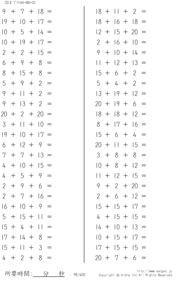 上記のボタンから「20までのAA+BB+CC」の算数数学ドリル・計算ドリル(PDFプリント)がダウンロードできます。個人利用は無料です(家庭以外での配布は有料です)。