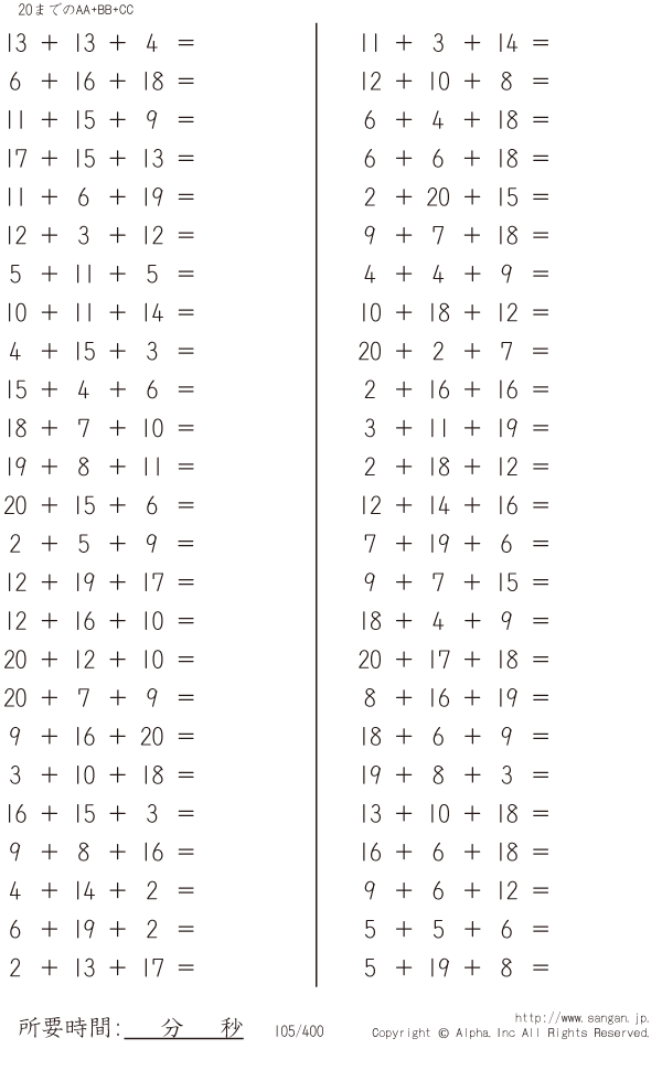 上記のボタンから「20までのAA+BB+CC」の算数数学ドリル・計算ドリル(PDFプリント)がダウンロードできます。個人利用は無料です(家庭以外での配布は有料です)。