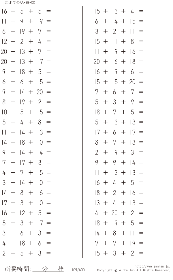上記のボタンから「20までのAA+BB+CC」の算数数学ドリル・計算ドリル(PDFプリント)がダウンロードできます。個人利用は無料です(家庭以外での配布は有料です)。