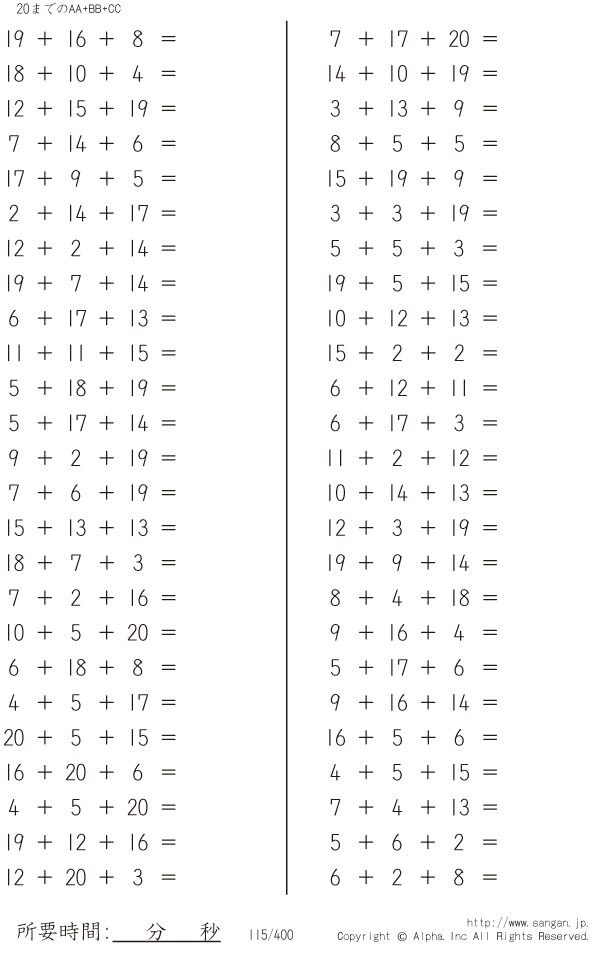上記のボタンから「20までのAA+BB+CC」の算数数学ドリル・計算ドリル(PDFプリント)がダウンロードできます。個人利用は無料です(家庭以外での配布は有料です)。