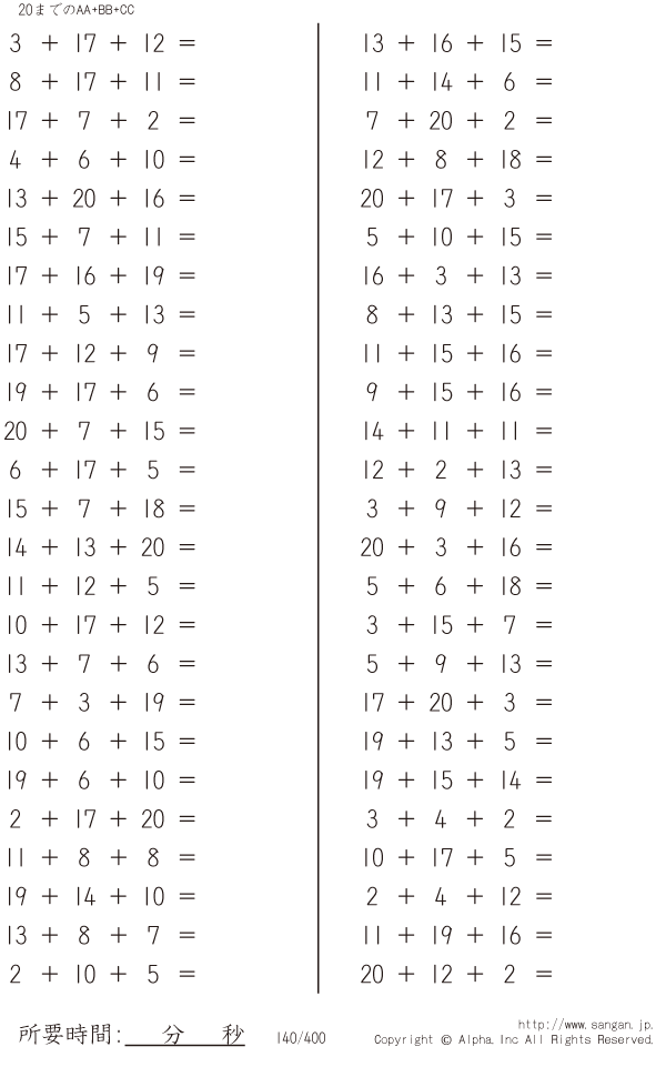 上記のボタンから「20までのAA+BB+CC」の算数数学ドリル・計算ドリル(PDFプリント)がダウンロードできます。個人利用は無料です(家庭以外での配布は有料です)。