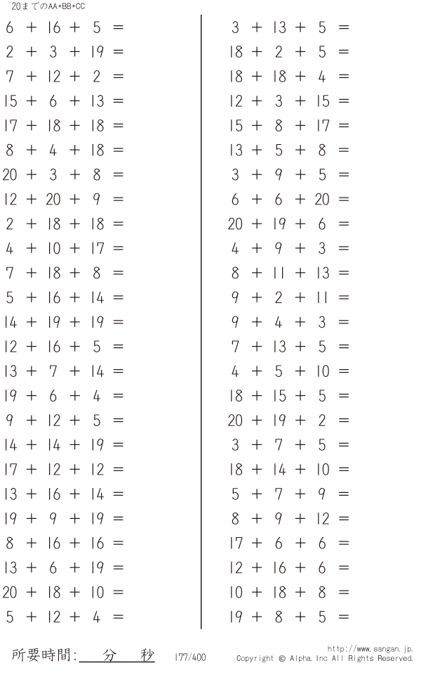 上記のボタンから「20までのAA+BB+CC」の算数数学ドリル・計算ドリル(PDFプリント)がダウンロードできます。個人利用は無料です(家庭以外での配布は有料です)。