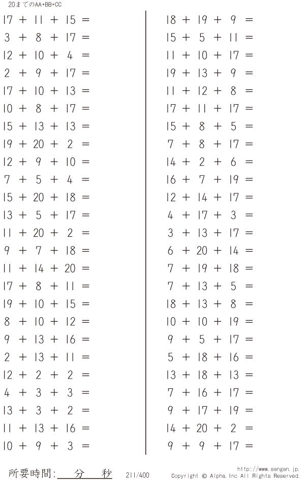 上記のボタンから「20までのAA+BB+CC」の算数数学ドリル・計算ドリル(PDFプリント)がダウンロードできます。個人利用は無料です(家庭以外での配布は有料です)。