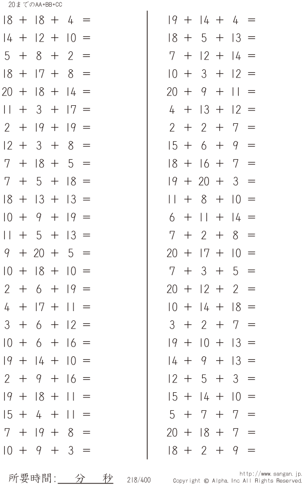 上記のボタンから「20までのAA+BB+CC」の算数数学ドリル・計算ドリル(PDFプリント)がダウンロードできます。個人利用は無料です(家庭以外での配布は有料です)。