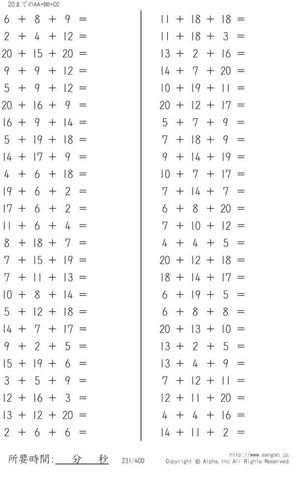 上記のボタンから「20までのAA+BB+CC」の算数数学ドリル・計算ドリル(PDFプリント)がダウンロードできます。個人利用は無料です(家庭以外での配布は有料です)。