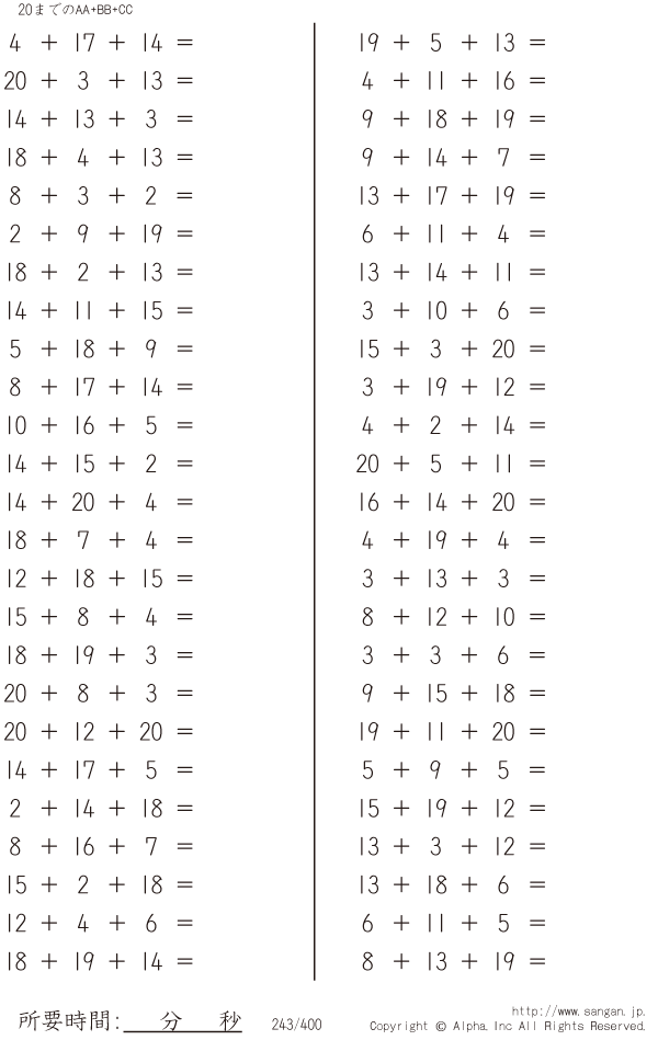 上記のボタンから「20までのAA+BB+CC」の算数数学ドリル・計算ドリル(PDFプリント)がダウンロードできます。個人利用は無料です(家庭以外での配布は有料です)。
