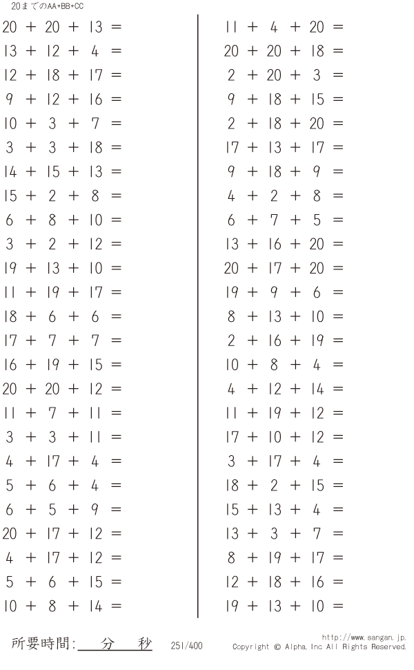 上記のボタンから「20までのAA+BB+CC」の算数数学ドリル・計算ドリル(PDFプリント)がダウンロードできます。個人利用は無料です(家庭以外での配布は有料です)。