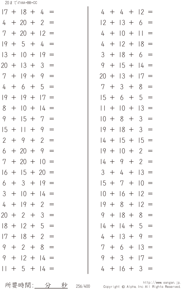 上記のボタンから「20までのAA+BB+CC」の算数数学ドリル・計算ドリル(PDFプリント)がダウンロードできます。個人利用は無料です(家庭以外での配布は有料です)。