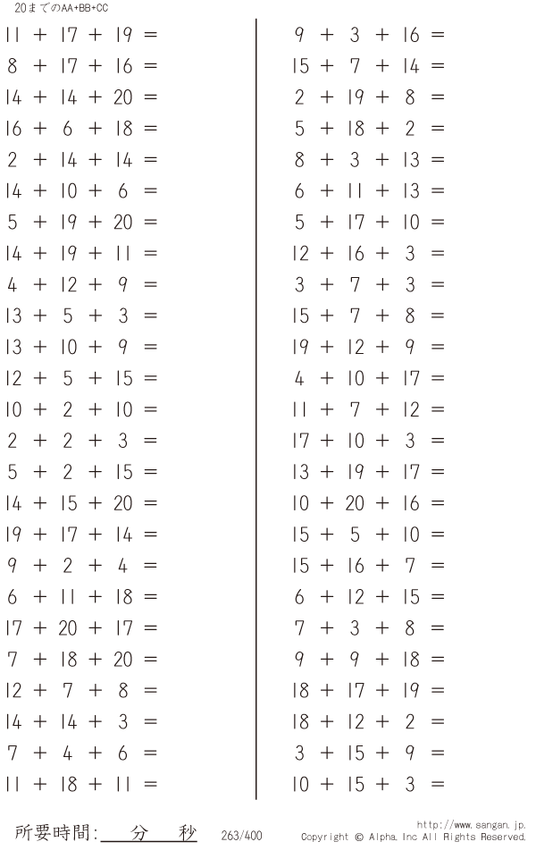 上記のボタンから「20までのAA+BB+CC」の算数数学ドリル・計算ドリル(PDFプリント)がダウンロードできます。個人利用は無料です(家庭以外での配布は有料です)。