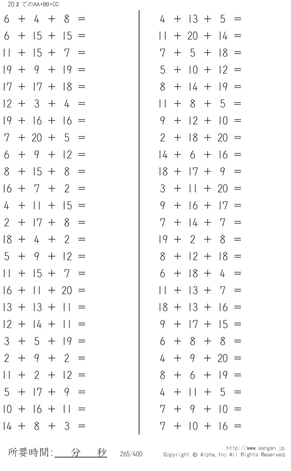 上記のボタンから「20までのAA+BB+CC」の算数数学ドリル・計算ドリル(PDFプリント)がダウンロードできます。個人利用は無料です(家庭以外での配布は有料です)。