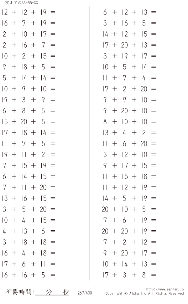 上記のボタンから「20までのAA+BB+CC」の算数数学ドリル・計算ドリル(PDFプリント)がダウンロードできます。個人利用は無料です(家庭以外での配布は有料です)。