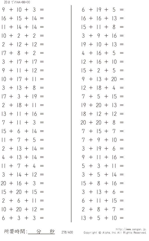 上記のボタンから「20までのAA+BB+CC」の算数数学ドリル・計算ドリル(PDFプリント)がダウンロードできます。個人利用は無料です(家庭以外での配布は有料です)。