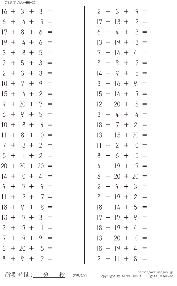 上記のボタンから「20までのAA+BB+CC」の算数数学ドリル・計算ドリル(PDFプリント)がダウンロードできます。個人利用は無料です(家庭以外での配布は有料です)。