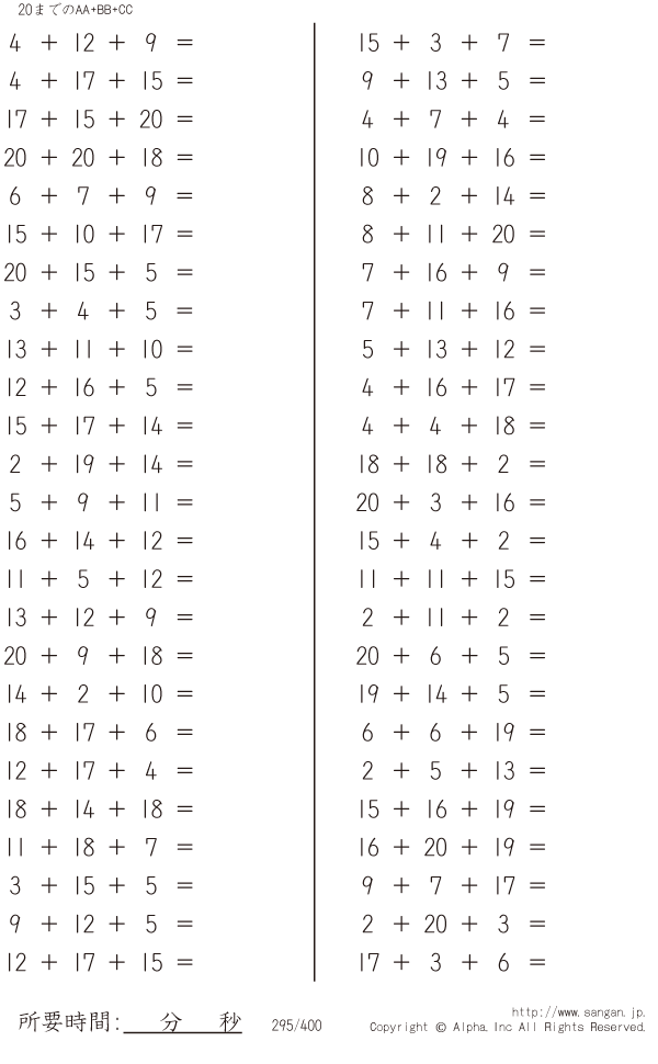 上記のボタンから「20までのAA+BB+CC」の算数数学ドリル・計算ドリル(PDFプリント)がダウンロードできます。個人利用は無料です(家庭以外での配布は有料です)。