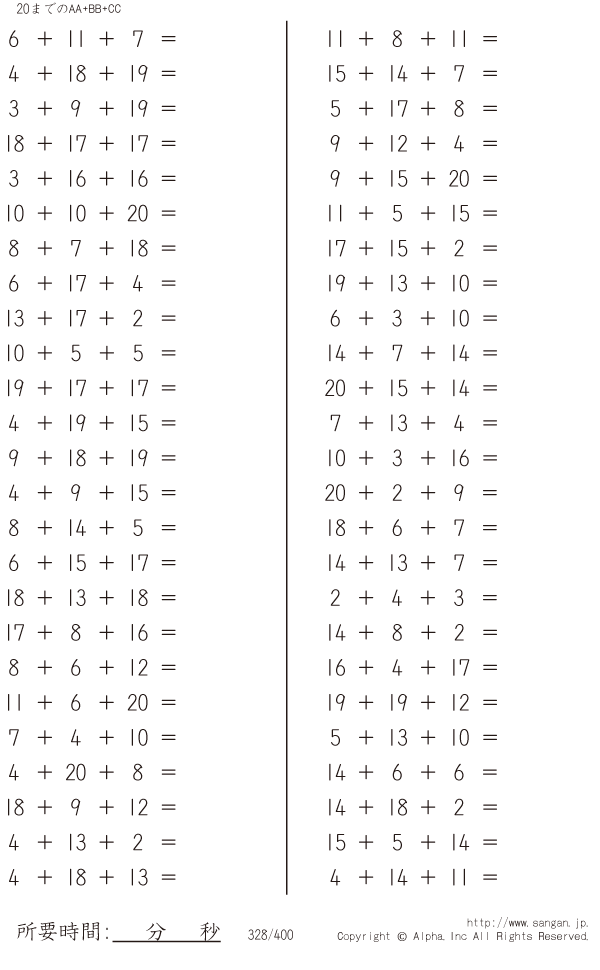 上記のボタンから「20までのAA+BB+CC」の算数数学ドリル・計算ドリル(PDFプリント)がダウンロードできます。個人利用は無料です(家庭以外での配布は有料です)。